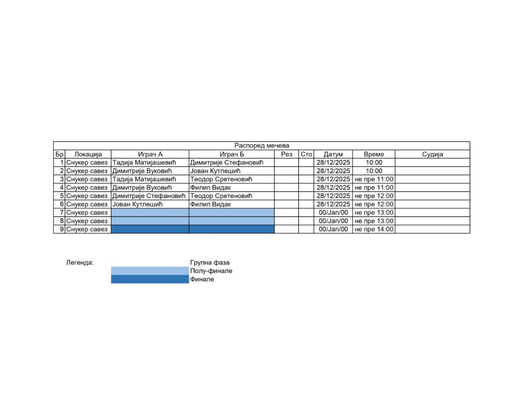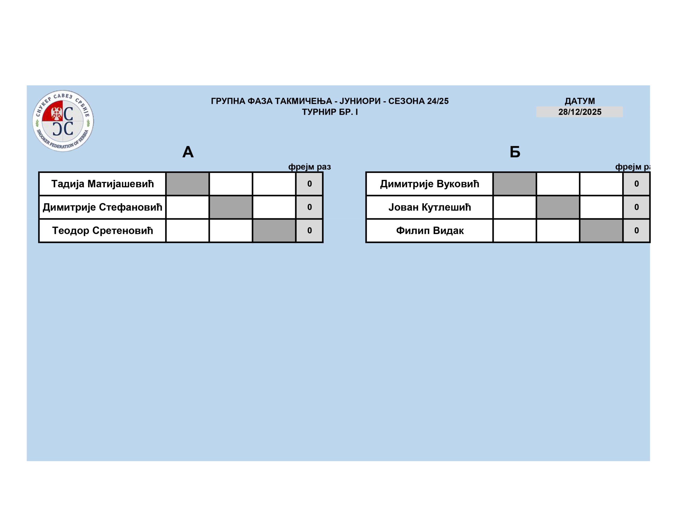Државно првенство – Јуниори 2Од: dusan / 25. децембар 2025. У наставку се налазе групе и распоред мечева за предстојећи турнир јуниора.