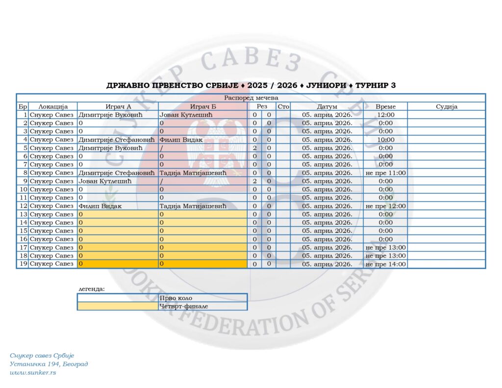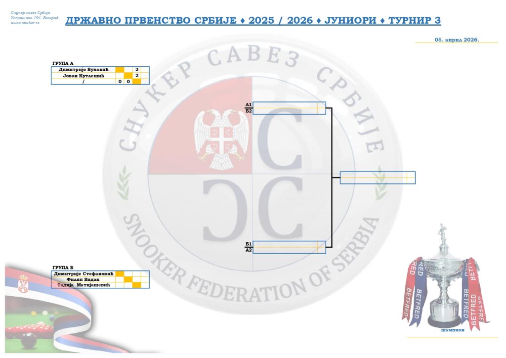 Државно првенство -Јуниори 3Од: dusan / 3. април 2026. У наставку се налазе групе и распоред мечева за предстојећи турнир јуниора.